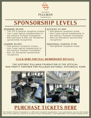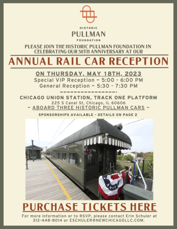 Join Historic Pullman Foundation’s Annual Rail Car Reception on Thursday, May 18, 2023 from 5:30 PM – 7:30 PM at Chicago’s Union Station on Track One Platform. We are thrilled to honor our loyal supporters and bring together the Pullman community as we celebrate our 50th anniversary and kick off the Pullman Railroad Days weekend!