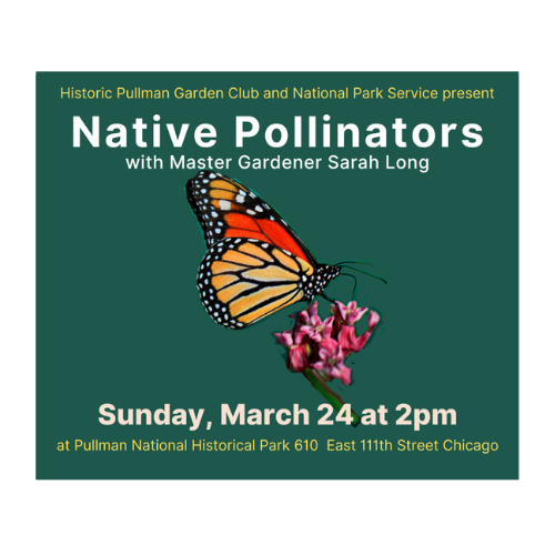 Join the Historic Pullman Garden Club and National Park Service for their Native Pollinators presentation Sunday, March 24 at 2pm. Don’t miss a fascinating lecture with Master Gardener Sarah Long from the University of Illinois Extension Service and hosted at the Pullman National Historical Park Visitor Center 610 East 111th Street. No reservations required & refreshments will be served. Everyone is welcome!