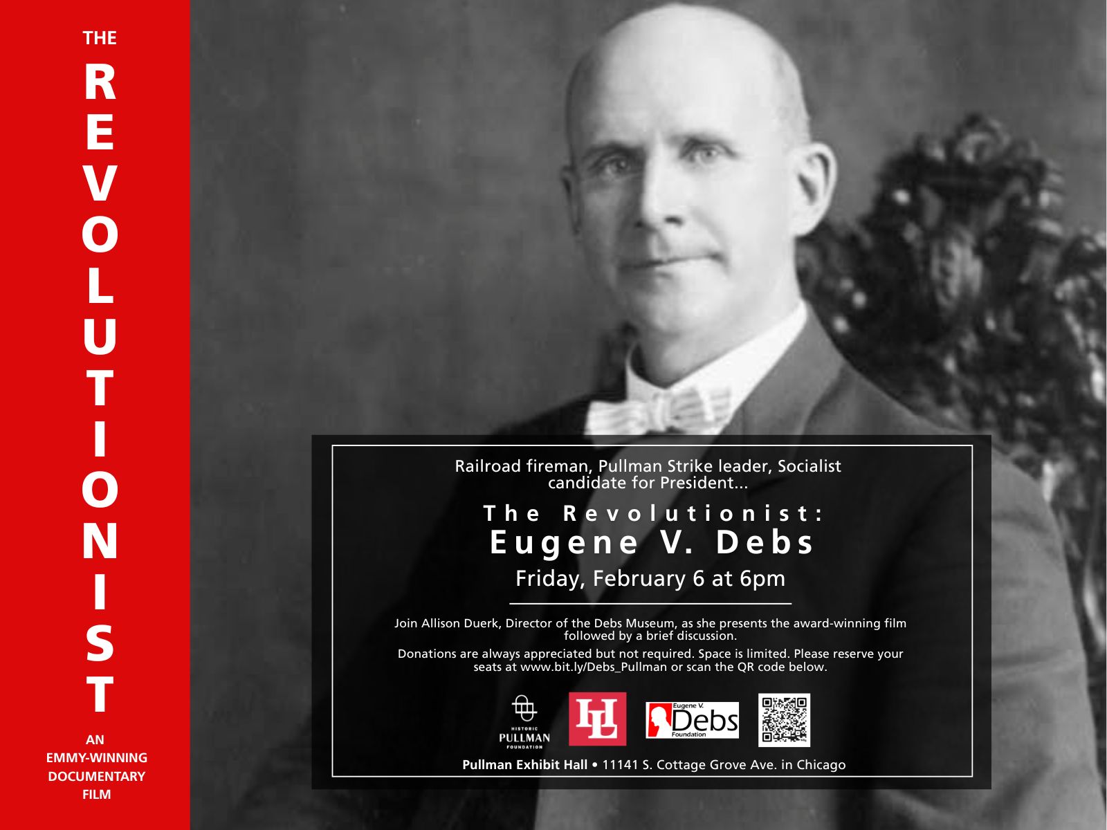 Feb 6 6:00 pm - 9:00 pm The Revolutionist: Eugene V. Debs HPF Pullman Exhibit Hall 11141 S. Cottage Grove Ave., Chicago Event Details Get Directions