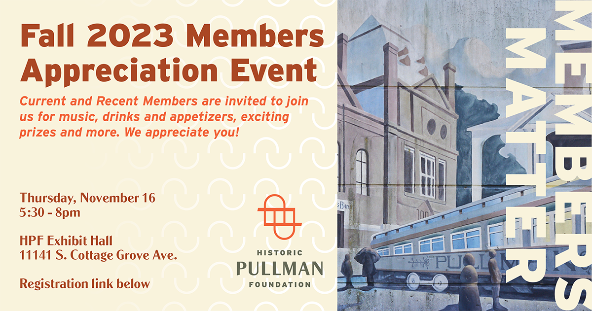 Nov 16 5:30 pm - 8:00 pm Fall 2023 Member Appreciation Reception HPF Pullman Exhibit Hall 11141 S. Cottage Grove Ave., Chicago Event Details Get Directions