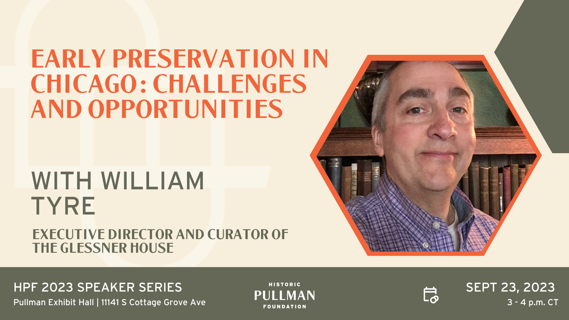 Sep 24 2:00 pm - 3:00 pm 2023 Speaker Series: Early Preservation in Chicago: Challenges and Opportunities HPF Pullman Exhibit Hall 11141 S. Cottage Grove Ave., Chicago Event Details Get Directions